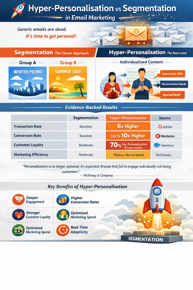 Where segmentation improves relevance for a group, hyper-personalisation creates a one-to-one dialogue, transforming the email into a conversation rather than a broadcast.