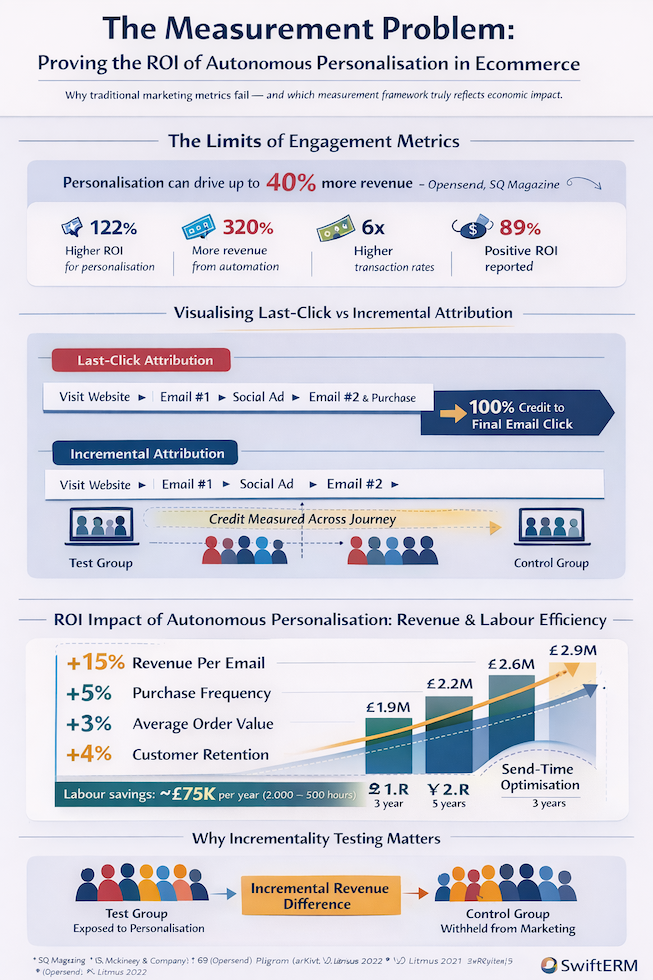 In environments where autonomous personalisation systems continuously optimise customer communications, incrementality testing becomes particularly important. It allows organisations to measure whether algorithmically generated recommendations genuinely increase purchasing behaviour rather than simply capturing credit for transactions that would have occurred anyway.imate marketing impact by 20–40% when compared with controlled experiments (Lewis and Rao, 2015).